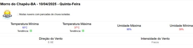 No município de Morro do Chapéu, a previsão para esta quarta-feira (9) indica céu com muitas nuvens e baixa possibilidade de chuvas, com temperaturas entre 18°C e 36°C. Já na quinta-feira (10), o tempo permanecerá nublado, mas com chance de pancadas de chuva isoladas, e temperaturas variando de 18°C a 37°C.