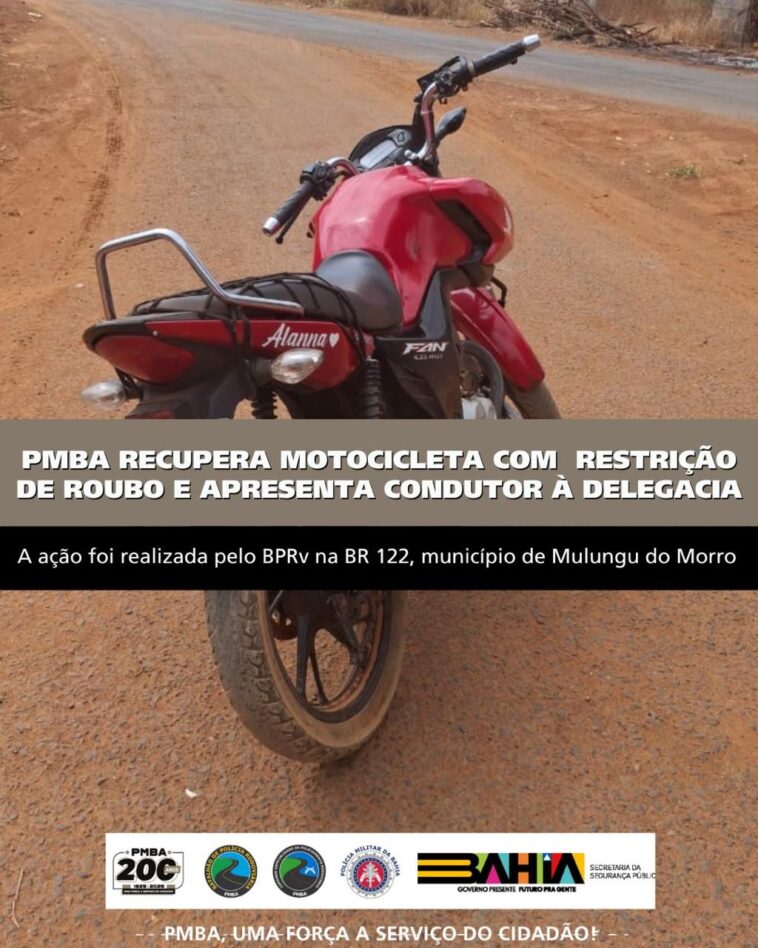 Na manhã desta quarta-feira (23), durante patrulhamento de rotina na BR-122, nas proximidades do KM 385, no município de Mulungu do Morro, uma guarnição da 2ª Companhia do Batalhão de Polícia Rodoviária abordou uma motocicleta Honda/CG 160 Titan, de cor vermelha, com placa LU*5A*6, conduzida por I. dos S. D.