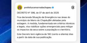 A Prefeitura de Morro do Chapéu, na região da Chapada Diamantina, decretou situação de emergência na segunda-feira (7) em razão da estiagem prolongada que atinge todo o município desde outubro de 2024. O Decreto 396/2025, assinado pela prefeita Juliana Araújo (PDT), tem validade de 180 dias e busca viabilizar ações urgentes de enfrentamento à seca, além de solicitar apoio dos governos estadual e federal.