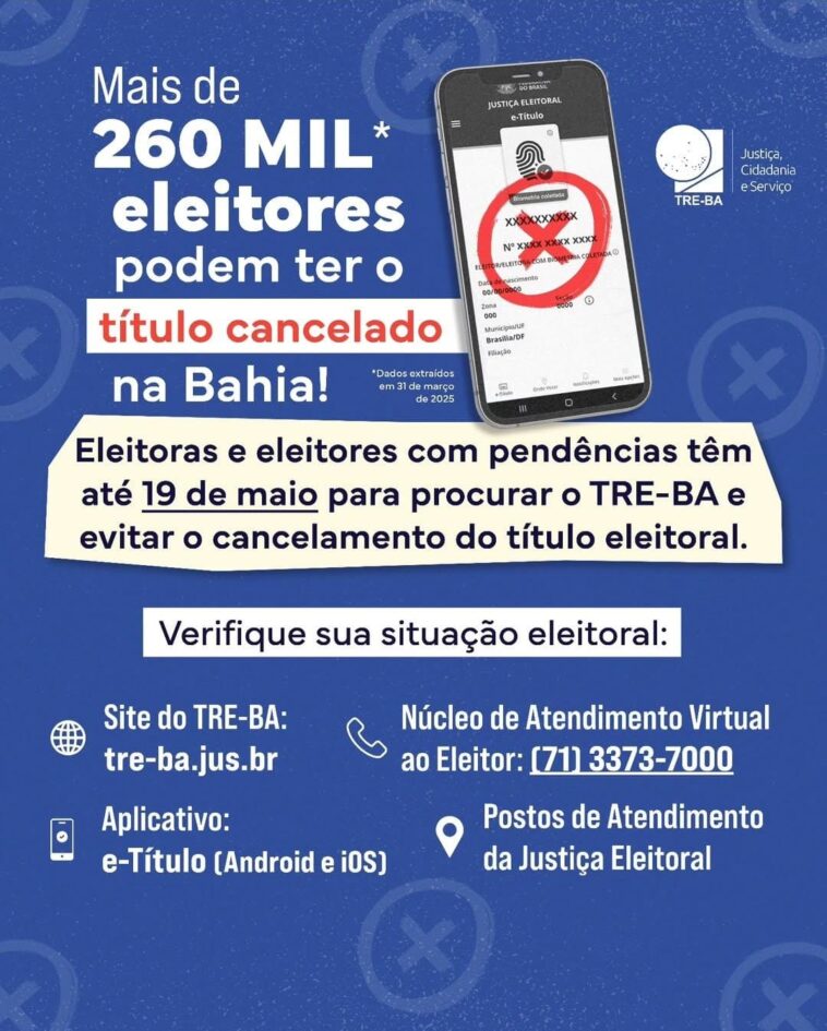 Para consultar se está com pendências na Justiça Eleitoral, é preciso acessar um dos seguintes canais: site do TRE-BA (www.tre-ba.jus.br), aplicativo e-Título (disponível gratuitamente para Android e iOS) ou pelo telefone (71) 3373-7000. A consulta também pode ser feita presencialmente em um cartório eleitoral ou nos postos da Justiça Eleitoral.