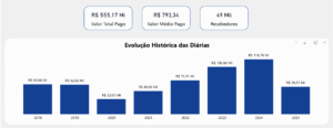 Segundo a série histórica, os pagamentos anuais oscilaram ao longo dos últimos oito anos. O menor desembolso foi registrado em 2020, no auge da pandemia da Covid-19, totalizando R$ 32,05 milhões. Já o maior valor foi contabilizado em 2024, com R$ 116,76 milhões pagos em diárias. Veja a evolução: