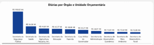 A Secretaria da Segurança Pública (SSP) lidera o ranking dos órgãos com maior volume de diárias pagas, com um total de R$ 190,82 milhões. Em seguida, aparecem: